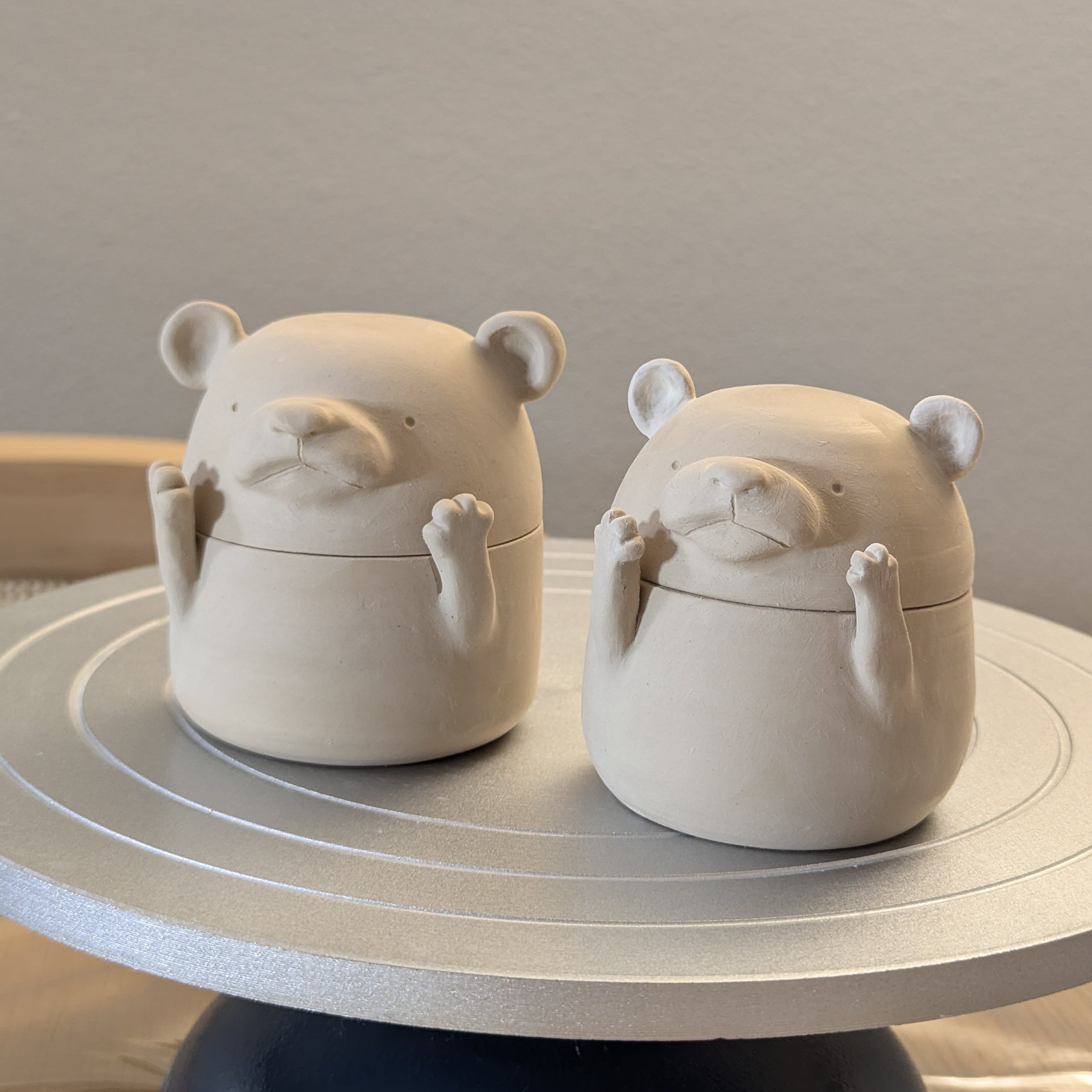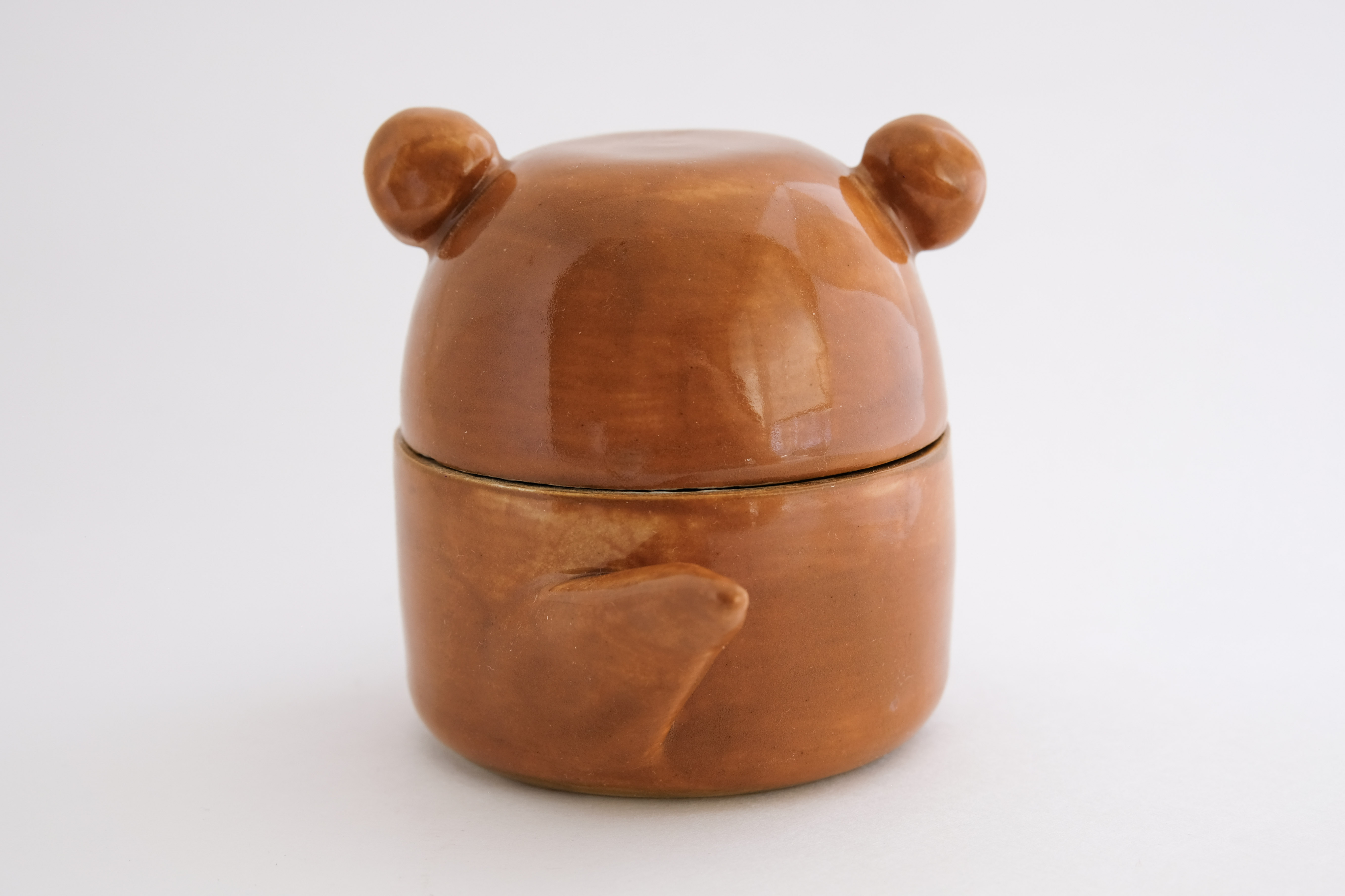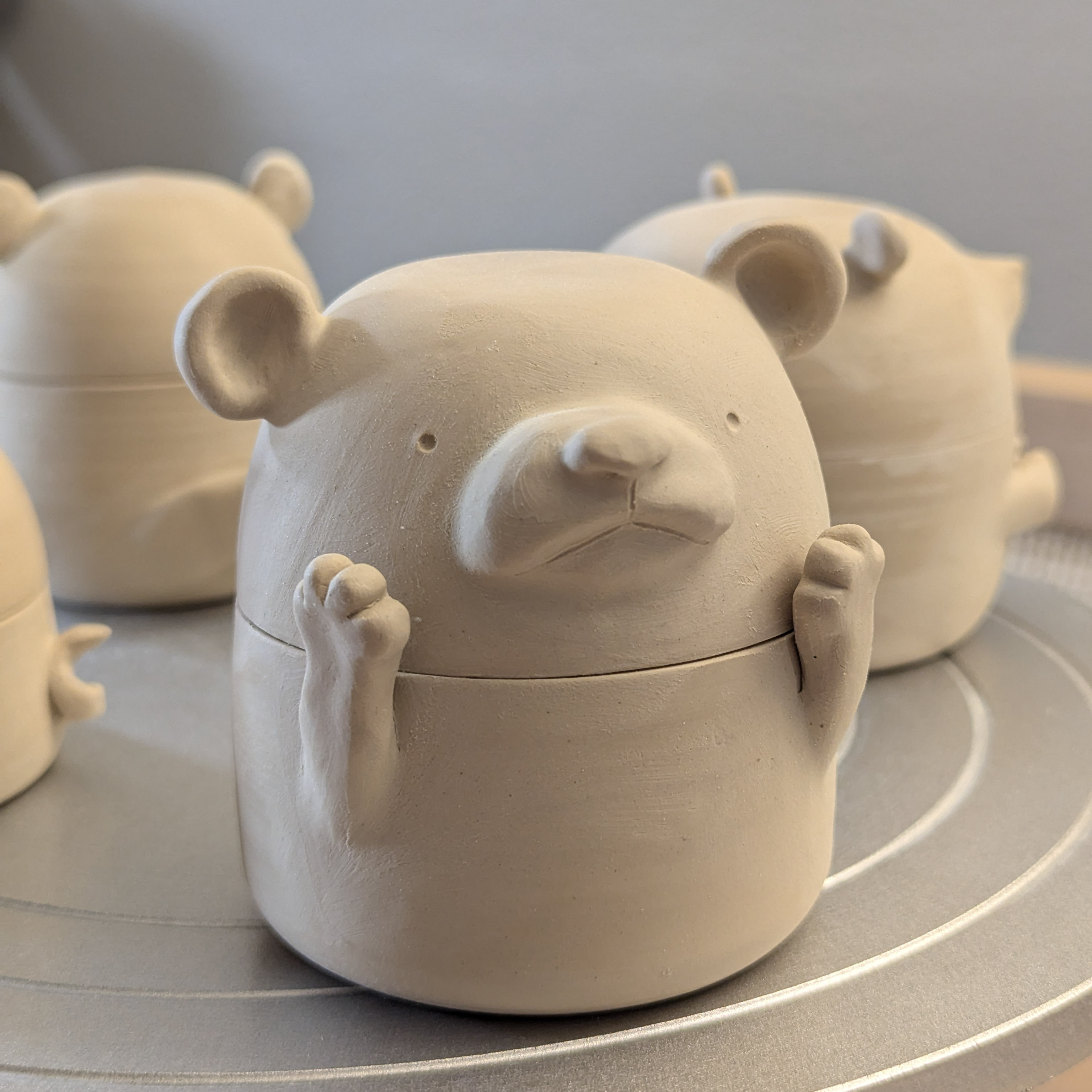Similar to how grey otter was made, this otter was only slighlty larger in size with a different colour palette. I chose to use the Teddy Bear Brown underglaze by Amaco Velvet Underglazes. This colour requires many layers of paint and I didn’t apply enough even coats which can be seen in the paint streaks lighter patches of brown. Although I forgot to apply white underglaze to the belly, the creamy colour of the raw bmix clay contrasted nicely with the darker brown anyways.